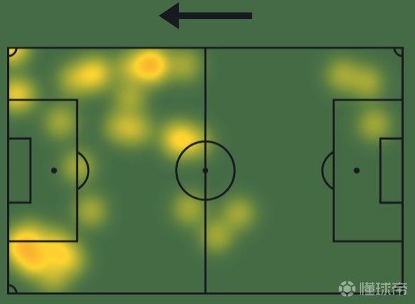 在赛后的热区图中,埃兰加的活动范围主要集中在对方禁区周围,尤其是在射门的位置,这也与他的两次进球位置相吻合。他在场上的活跃度和射门位置的选择都展现出了他的出色表现。整体来看,埃兰加在这场比赛中可以说是完美诠释了一名前锋应有的表现,全面发挥了自己的能力,为球队赢得了胜利。